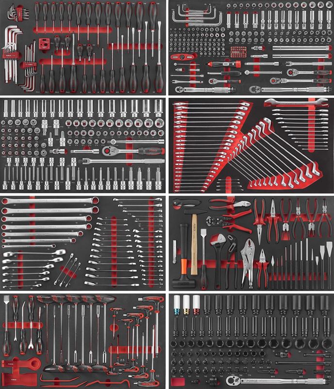 8 Foam tooltrays gevuld met 610 stuks gereedschap