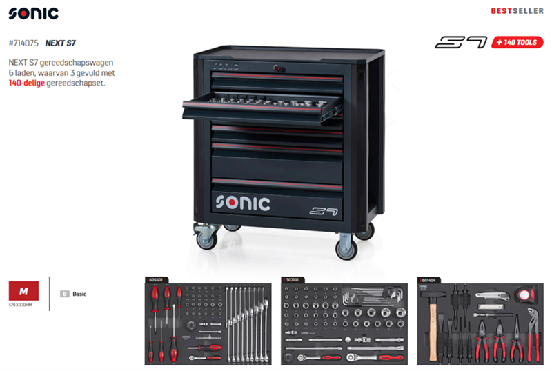 De NEXT S7 is een instap-/middenklasse gereedschapswagen, ontworpen om een compacte maar toch efficiënte werkoplossing te bieden voor werkplaatsen en technici. De wagen is compleet geleverd met een assortiment van 140 delen gereedschap.